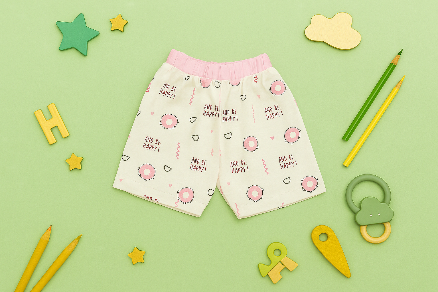 🩳 Coordinated Printed Shorts: Comes with matching elastic-waist shorts, covered in fun donut and coffee illustrations to complete the look.